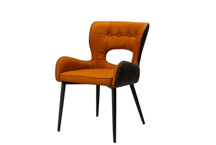 - A bold modern dining chair with a sculpted cut-out back, soft upholstery, and sleek metal legs – comfort with style.